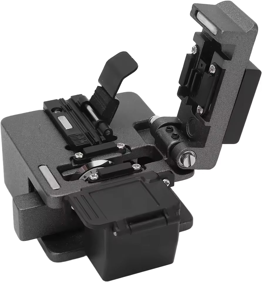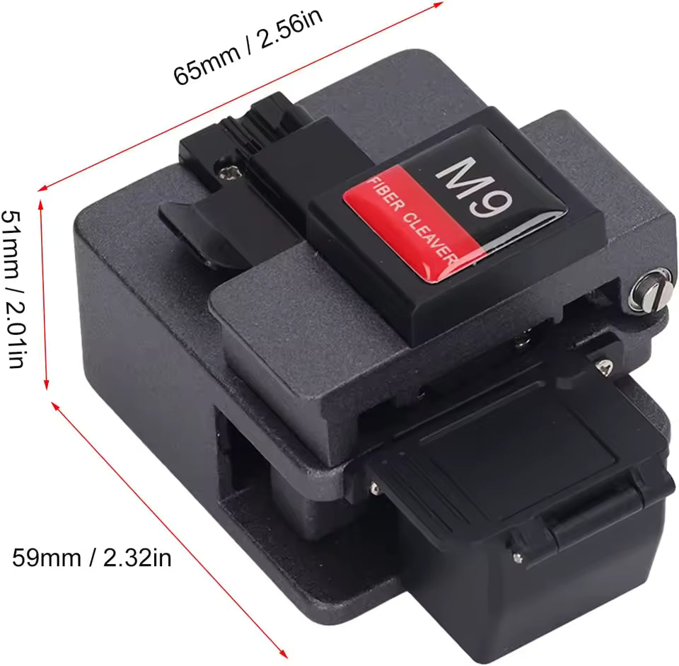 Modelo: F Cleaver M9 Aplicación principal: cortes de fibra óptica en proyectos FTTH y empalmes por fusión Diámetros de fibra compatibles: 0.25 µm y 0.9 µm Vida útil de la cuchilla: hasta 48,000 cortes Material: construcción metálica resistente Rango de temperatura operativa: de −40 °C a +80 °C Dimensiones: 8cm × 9cm × 9cm Peso: 200g